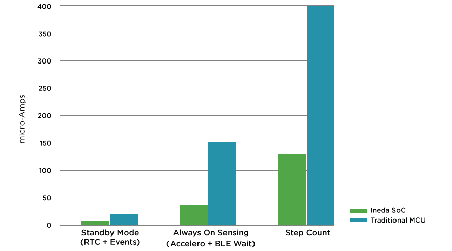 In comparison to traditional microcontroller (MCU) or Application processor (APU) designs, Ineda’s I3 and I7 Series of SoCs are optimized to consume much lesser power. By utilizing the Always-ON sensing capability in combination with the hierarchical CPU architecture, the SoCs can be configured to operate as a well-optimized WPUTM.