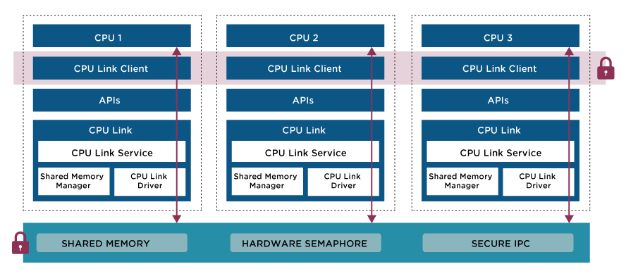 Ineda’s family of SoCs provides a secure and highly efficient inter-processor communication infrastructure using CPU Link services. The CPU Link is specifically designed to deliver low latency and low overhead communication between processors with diverse performance and memory resources. It uses fast interrupt mechanism to implement low latency for short messages and synchronization. It utilizes shared memory to achieve low overhead (aka “zero-copy”) so data passes by reference rather than physically being copies. Since resources and peripherals are shared between multiple processors, a lightweight semaphore mechanism allows implementation of synchronization primitives to surround critical sections of code and ensure there is no resource contention.